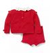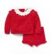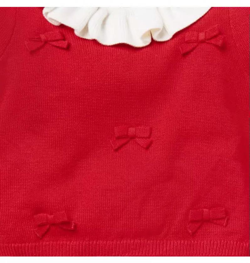 First moments, finished with a bow. Our soft sweater set is designed in pure cotton, with allover applique bows and a contrast ruffle collar too.