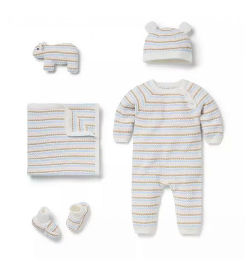 Welcome baby to the world with everything you need for every first. Featuring a striped textured knit sweater one-piece with a matching bear beanie and all the little extras to love.