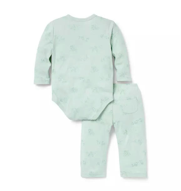 Welcome baby in our soft cotton set featuring an allover farm animal toile. With a kimono-inspired wrap bodysuit and a pull-on pant with a little back pocket, just because.