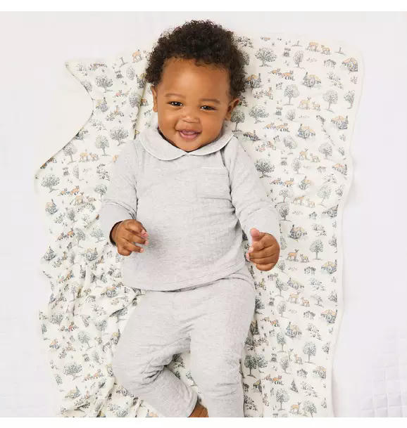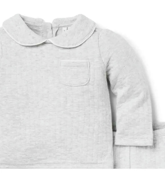 The perfect match for first moments. Our cozy set features allover quilting, piped details and little pockets too.