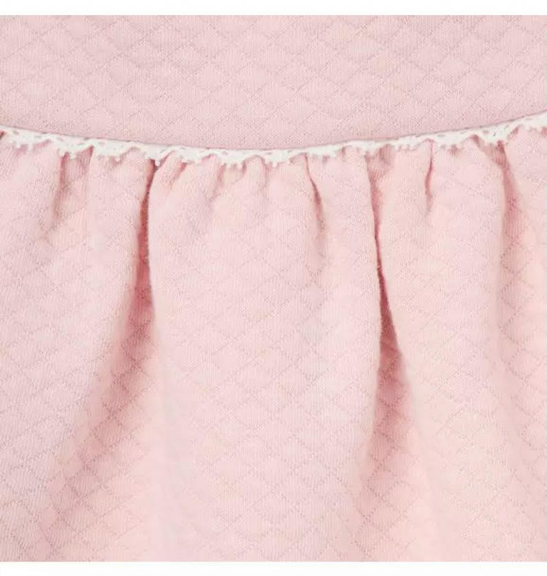 All of our favorite details for this matching set. From the allover quilting to the puff sleeves, ruffle cuffs and crochet trim, it’s just right for every first.