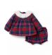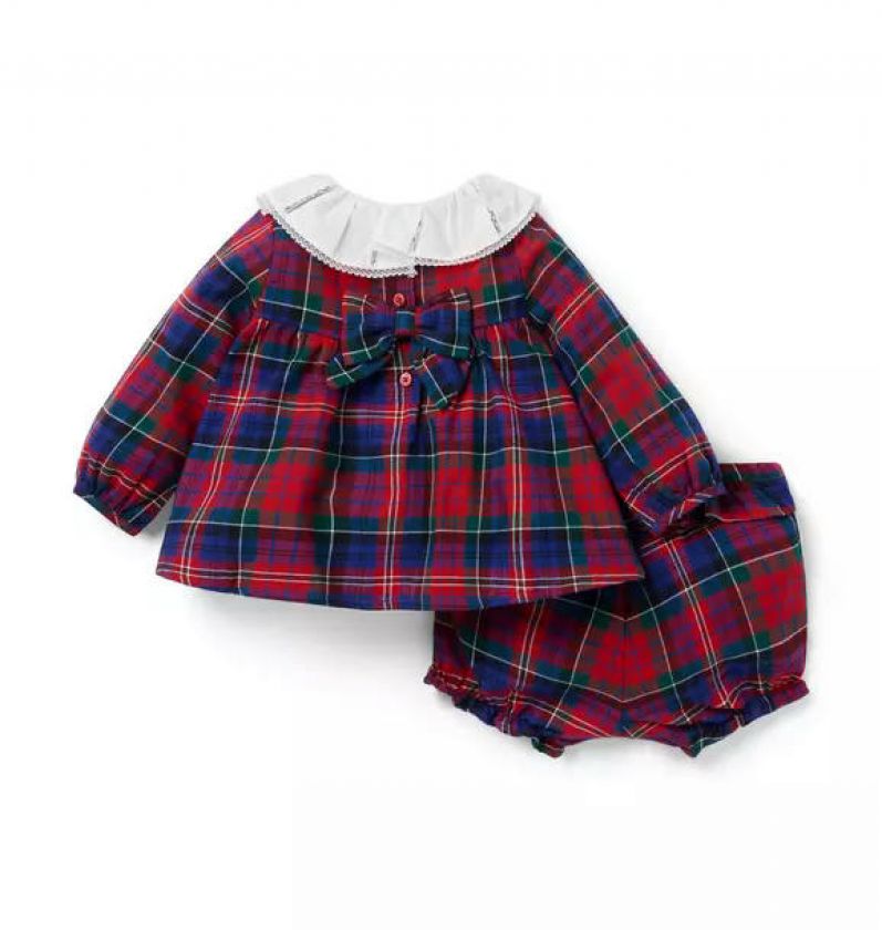 Our soft brushed twill set is the perfect match for first holiday moments and family memories. Detailed with allover tartan, a ruffled collar and a bow at the back.