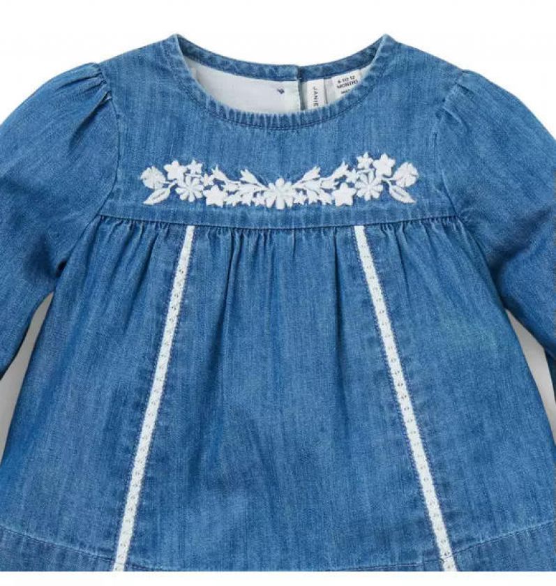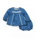 Embroidered florals and classic chambray make the perfect match. With lace trim, ruffle details and a bow at the back, our set is just right for first moments.