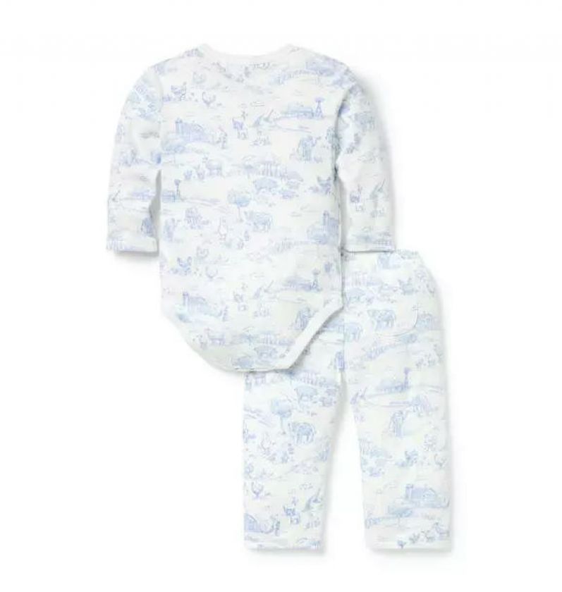 Welcome baby in our soft cotton set featuring an allover farm animal toile. With a kimono-inspired wrap bodysuit and a pull-on pant with a little back pocket, just because.