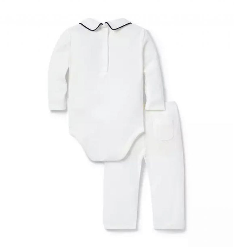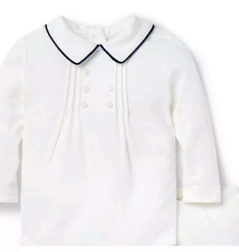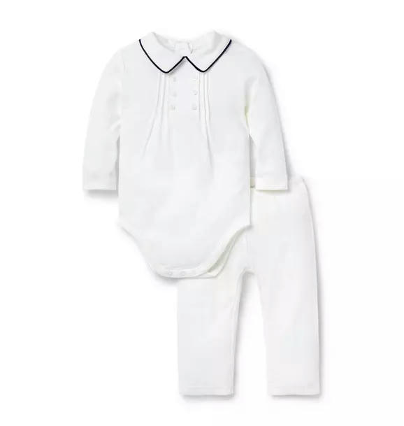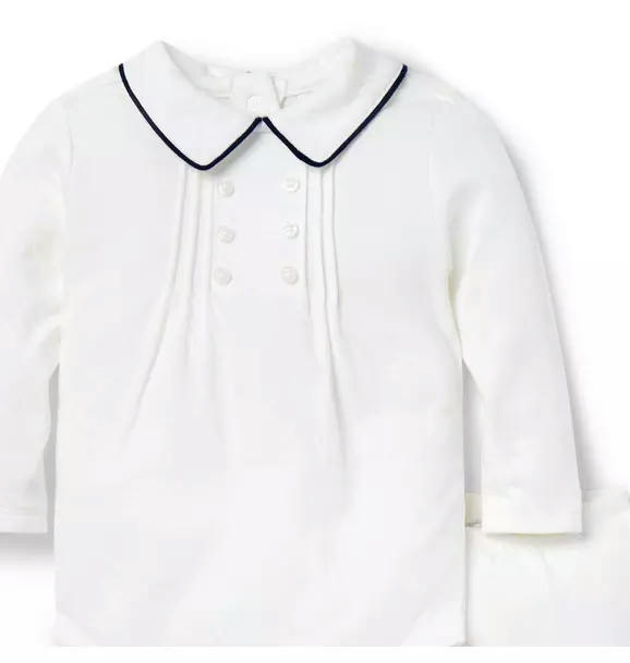 All set for first moments. Designed in soft, pure cotton with pintucks, contrast piping and little button details too.