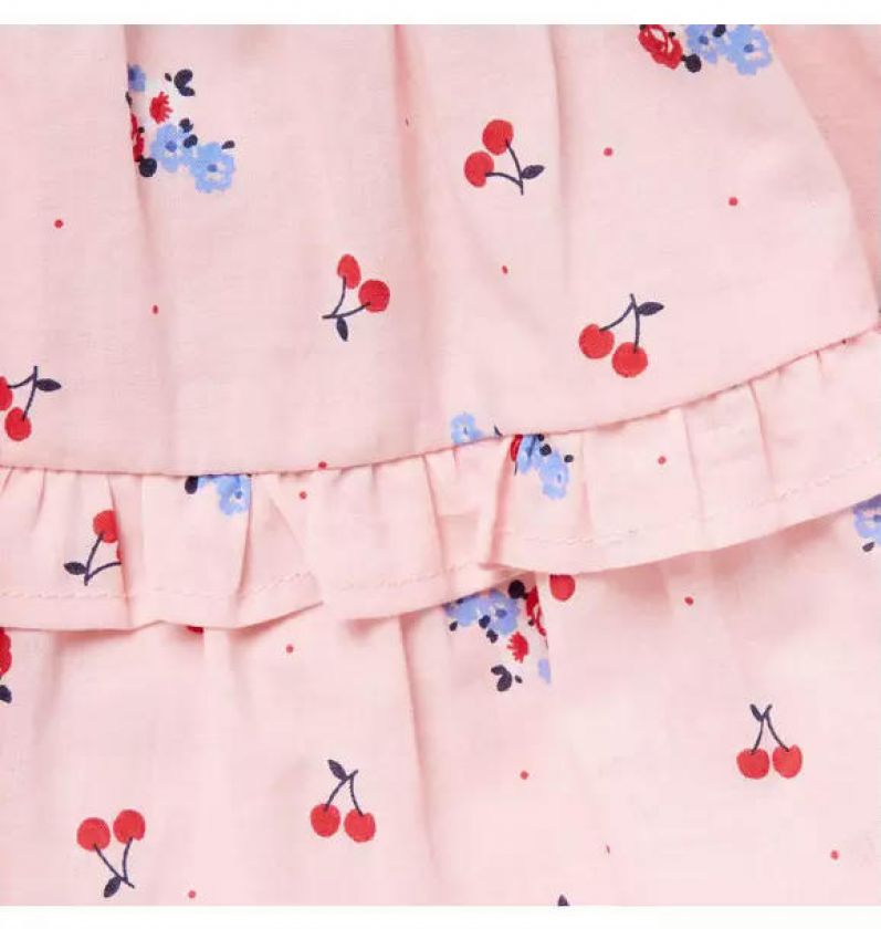 The sweetest details for this pure cotton favorite, from the allover cherry florals to the ruffle trim, bow details and tiered silhouette. It's perfect for special first moments.