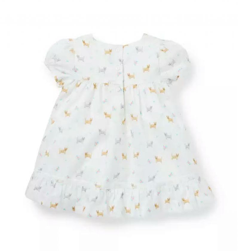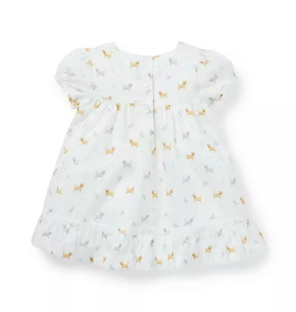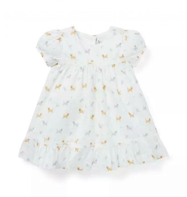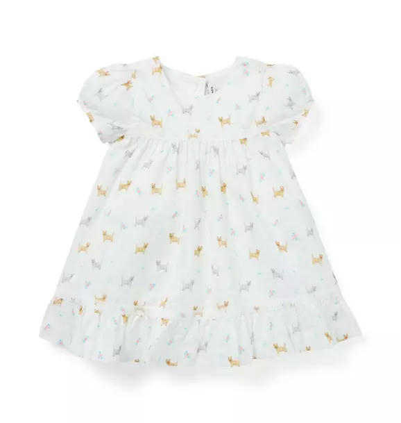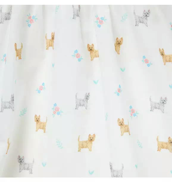 We're in puppy love with this pure cotton dress. With allover dog friends, puff sleeves and lace trim, it's perfect for first special occasions or just because.