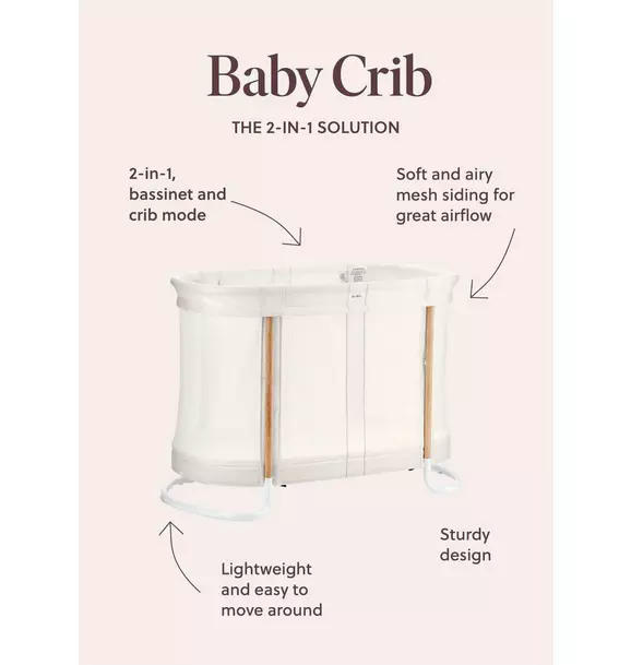 This 2-in-1 wonder easily transitions from a bassinet to a crib, making it perfect for your little one from newborn to toddler. We teamed up with safety experts to design a sturdy crib with soft mesh sides for great air flow and no hard bars for your baby to bump into. The mattress base is integrated into the crib's sides, eliminating any risk of babies getting caught between slats nor the mattress. Plus, all materials that touch your baby's skin meet the OEKO-TEX Standard 100, Class 1 for baby products, meaning they're super gentle and safe to taste.