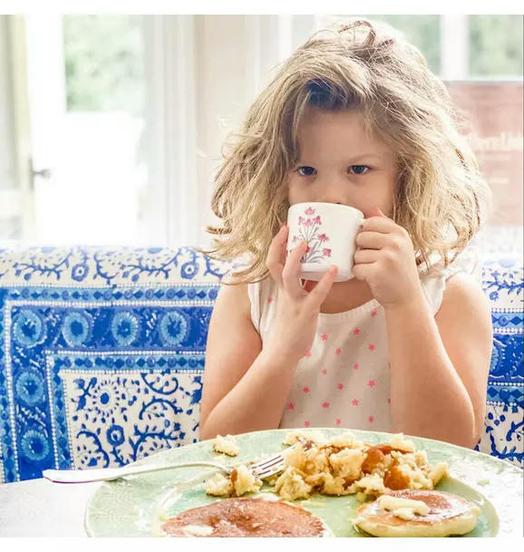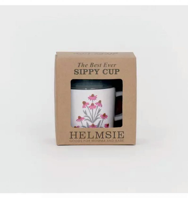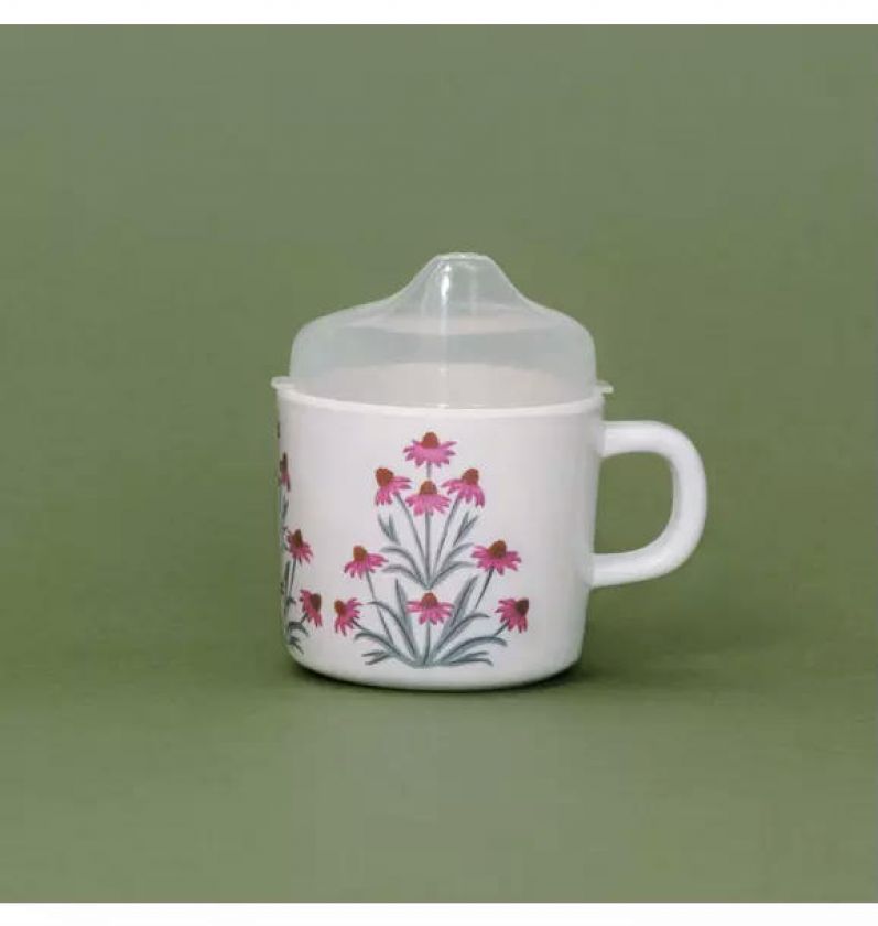 This easy-to-clean melamine sippy cup features bohemian, hand-painted gouache coneflowers wrapped around the mug, with a durable, dishwasher-safe design and a removable leak-resistant top that makes transitioning to a toddler cup simple and cheerful.