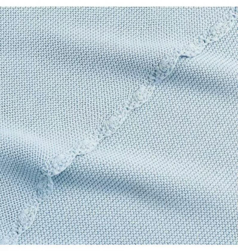 Knit Blanket: 100% cotton with a hand-stitched scalloped pattern. Size: 30” x 40”.