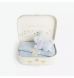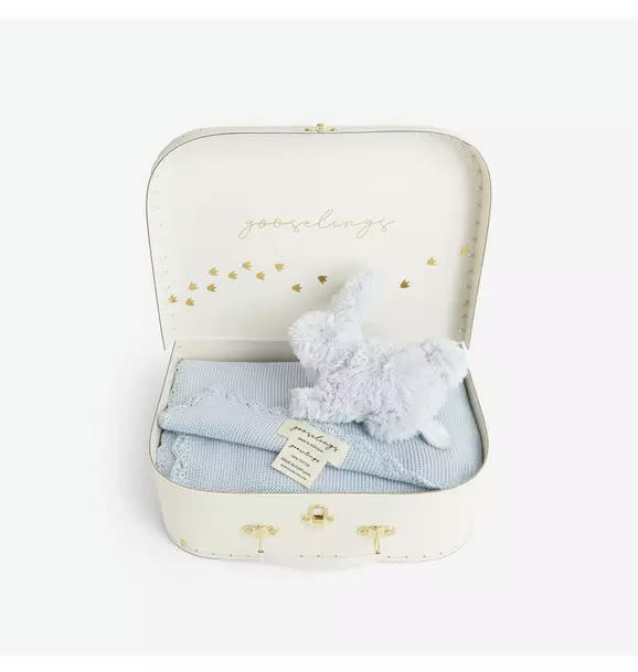 This Cozy Gift Box includes a beautifully crafted cotton knit blanket, a soft lovey, all elegantly packaged in a charming little suitcase perfect for storing toys and heirlooms.