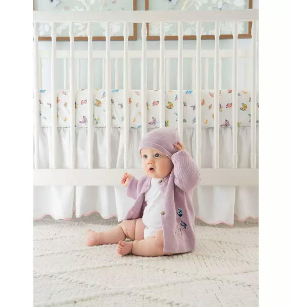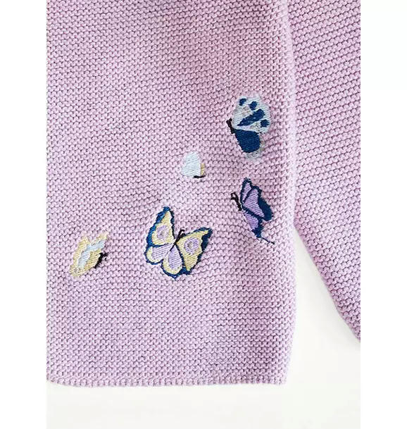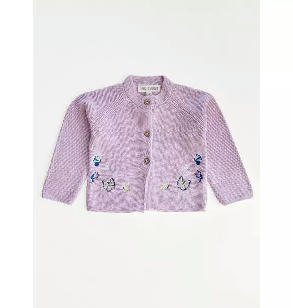 Delicate and charming, our Lavender Butterfly Cardigan is knit from 100% GOTS certified organic cotton and OEKO-TEX certified for gentle softness. Featuring beautifully embroidered butterflies inspired by our original watercolor Tropical Chinoiserie painting, it’s a wearable work of art.