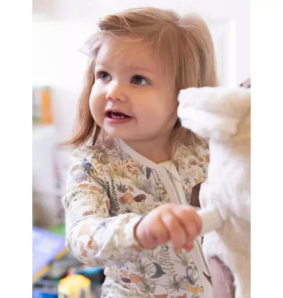 A soft essential, thoughtfully designed. This one-piece in our signature Foxy Forest print is as practical as it is charming. Made for comfort and ease, it features fold-over hand mittens (up to size 9–12 months) to help prevent scratches, convertible foot cuffs for room to grow, and a double zipper for quick, no-fuss diaper changes. Everyday ease, with a little extra joy. **Adheres to CPSC safety regulations and never treated with flame-retardants or chemicals.