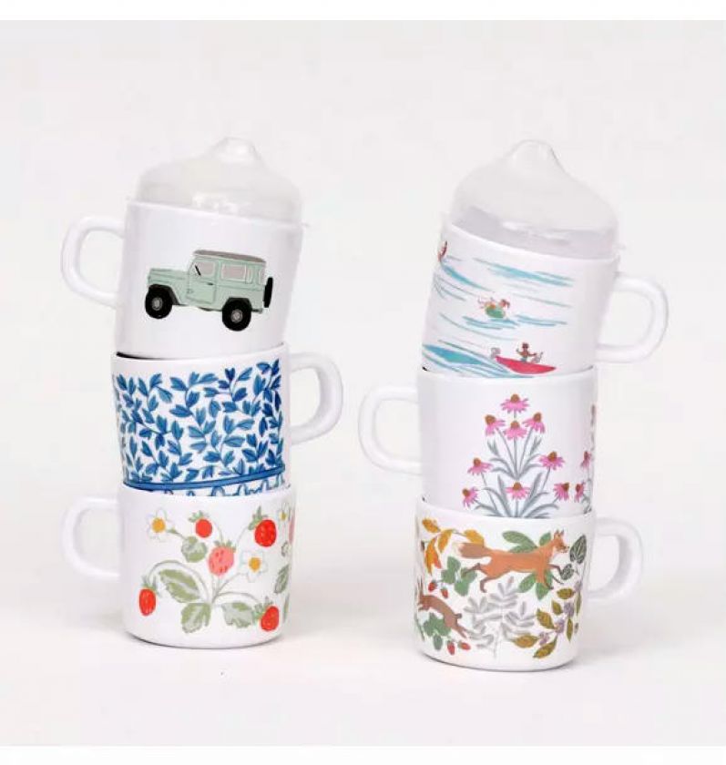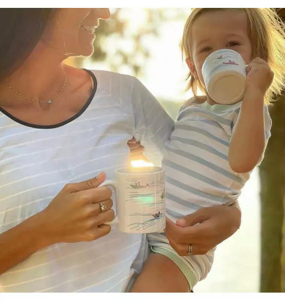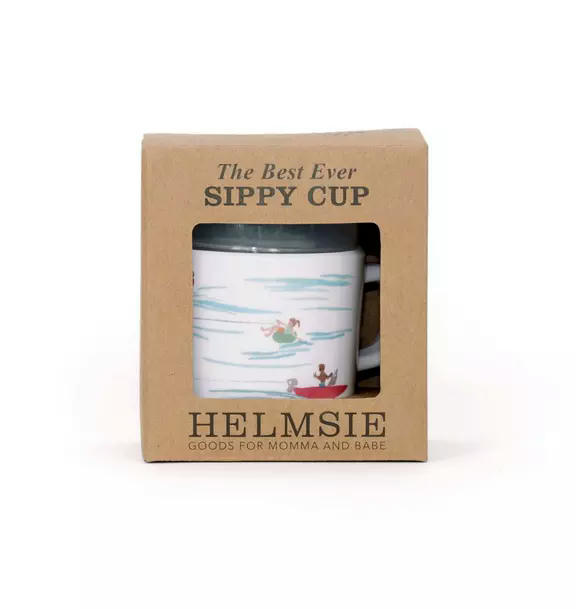 This easy-to-clean melamine sippy cup features a charming watercolor wave-and-boater design with a durable, dishwasher-safe finish and a removable, leak-resistant top for an easy transition to a toddler mug.