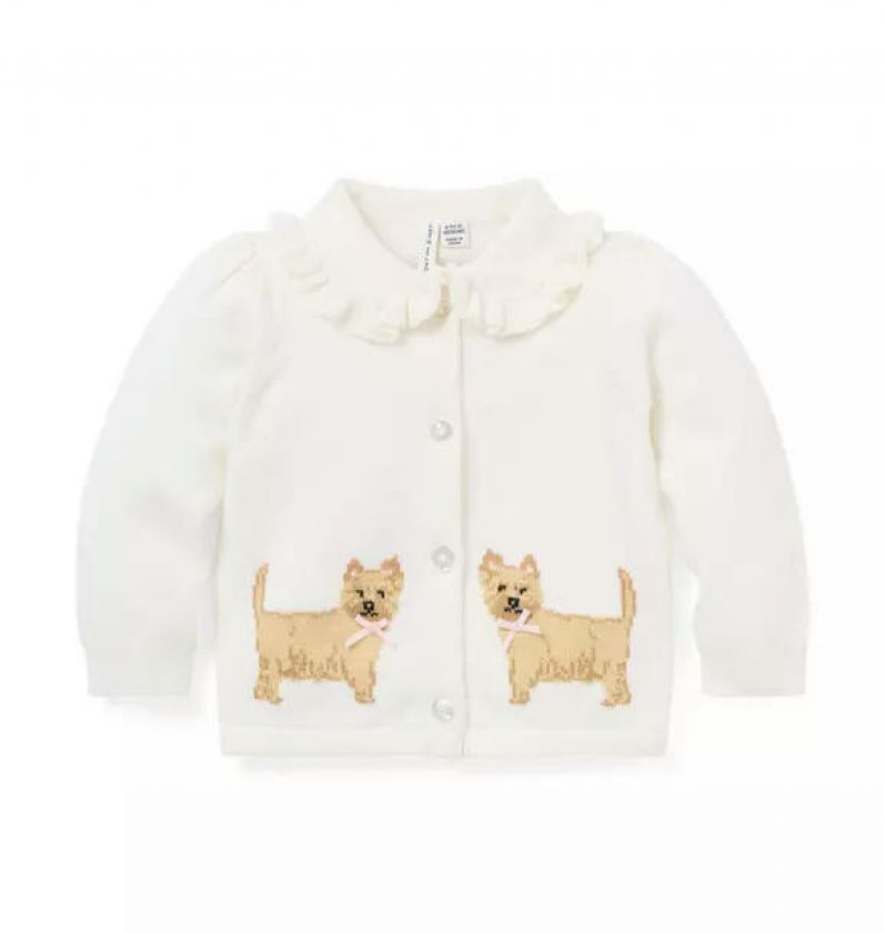 Consider it puppy love. Our cardigan is designed with intarsia-knit dogs, a ruffle trimmed collar and little bow details too.