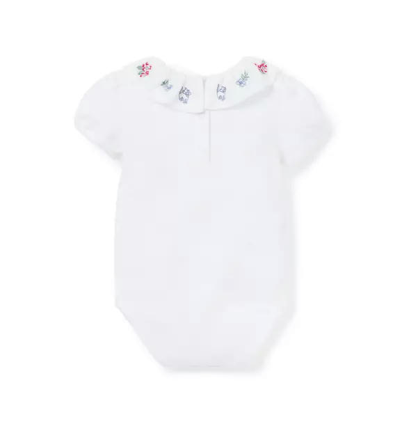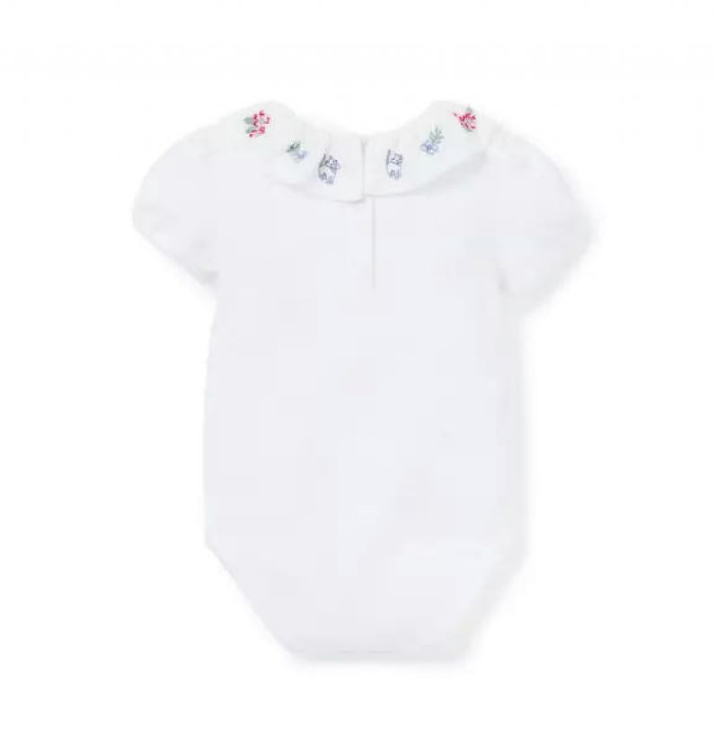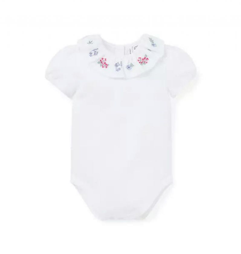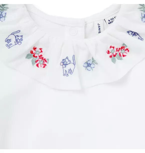 Kittens and flowers make our bodysuit extra special for every first. In pure, soft cotton with an embroidered ruffle collar and puff sleeves.