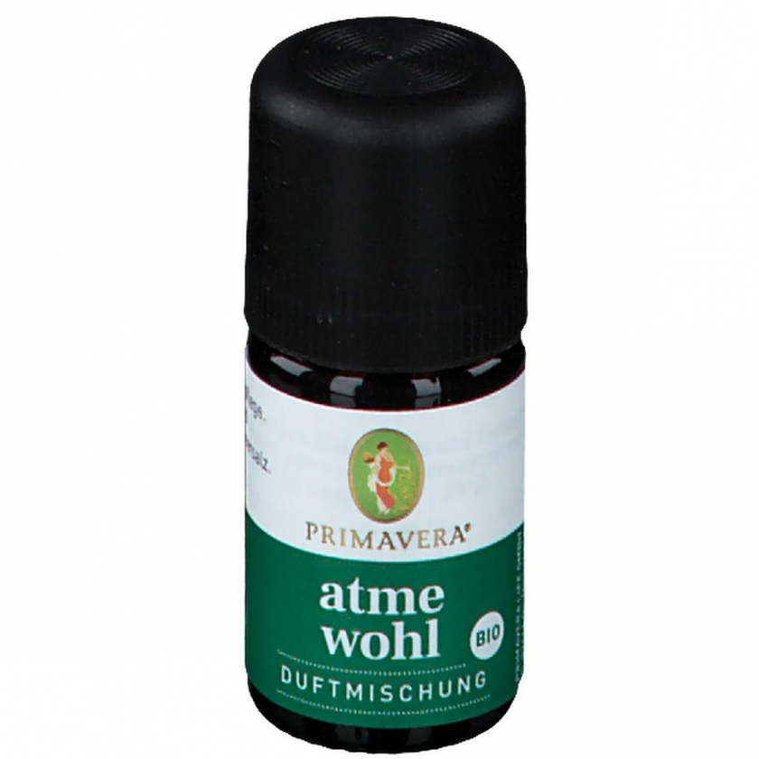 Ароматерапевтическая смесь эфирных масел PRIMAVERA Atmewohl для укрепления иммунитета и улучшения дыхания. Содержит 100% натуральные био-масла эвкалипта, еловой хвои и розмарина. Используется как добавка для ванн для глубокого прогревания тела и укрепления дыхательных путей, особенно в холодное время года. Подходит для взрослых и детей (с разведением). Сертифицирована как био-косметика NATRUE, без тестирования на животных, веганская.