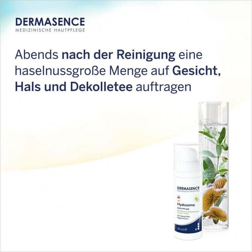 Ночной крем DERMASENCE Hyalusome для интенсивного ухода за сухой и зрелой кожей. Содержит гиалуроновую кислоту для глубокого увлажнения, пантенол и антиоксиданты для регенерации, масла жожоба и вечерней примулы для укрепления кожного барьера. Подходит для использования как ночной крем или маска. Дерматологически протестирован.