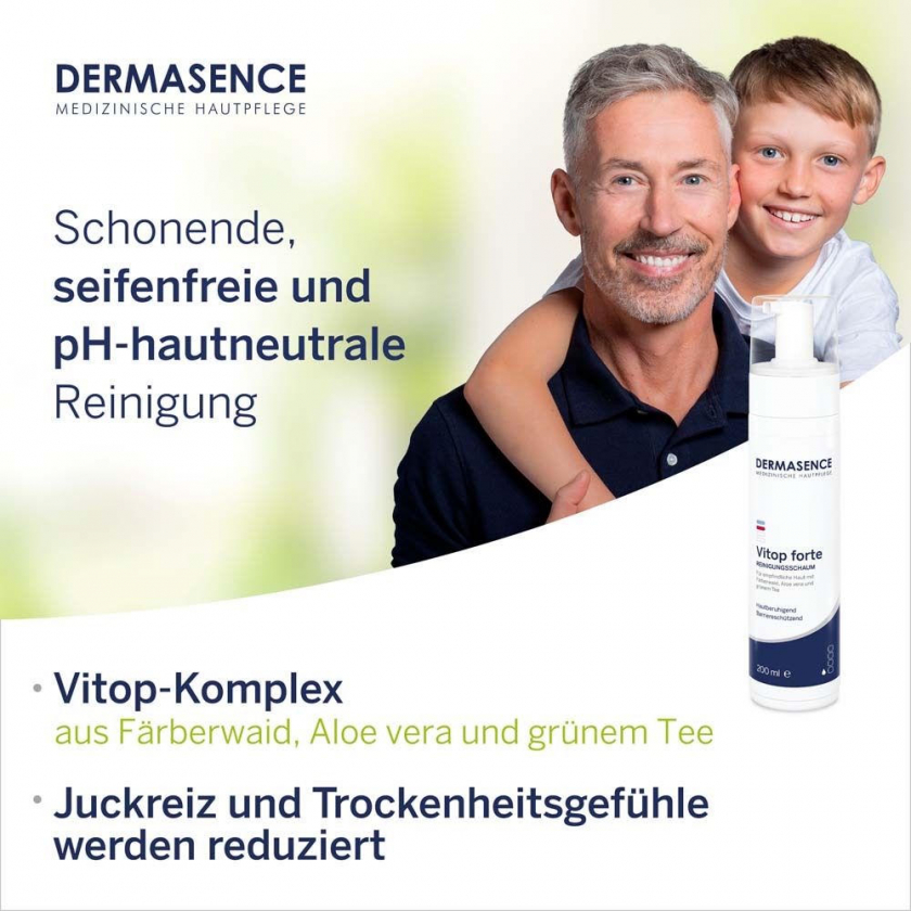 DERMASENCE Vitop forte Reinigungsschaum - мягкий очищающий пенящийся гель для чувствительной кожи, склонной к покраснениям и зуду. Содержит уникальный Vitop-комплекс из вайды красильной, алоэ вера и зеленого чая. Защищает естественный барьер кожи, помогает уменьшить зуд и ощущение сухости, сохраняет уровень увлажнения. Рекомендован как сопутствующее средство для очищения при нейродермите и псориазе.