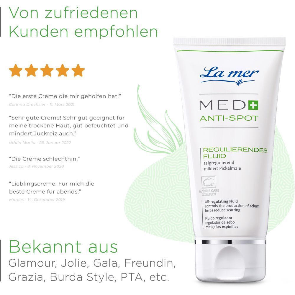 La mer MED+ Anti Spot - регулирующая сыворотка для проблемной кожи. Регулирует выработку кожного сала, уменьшает черные точки и прыщи, успокаивает покраснения, увлажняет кожу и улучшает ее текстуру. Содержит Marine Care Complex из морского ила, зеленых водорослей и морской соли.