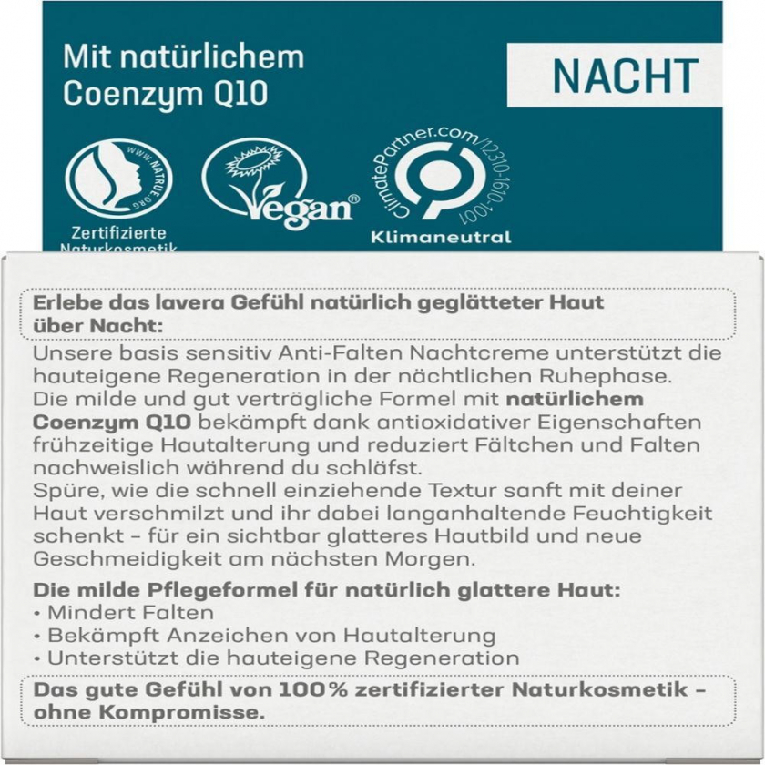 Ночной крем против морщин Lavera Basis Sensitiv с натуральным коэнзимом Q10, органическим маслом жожоба и маслом ши. Сертифицированная натуральная косметика, поддерживающая регенерацию кожи ночью, предотвращающая преждевременное старение и увлажняющая кожу. Быстро впитывается, подходит для чувствительной кожи.