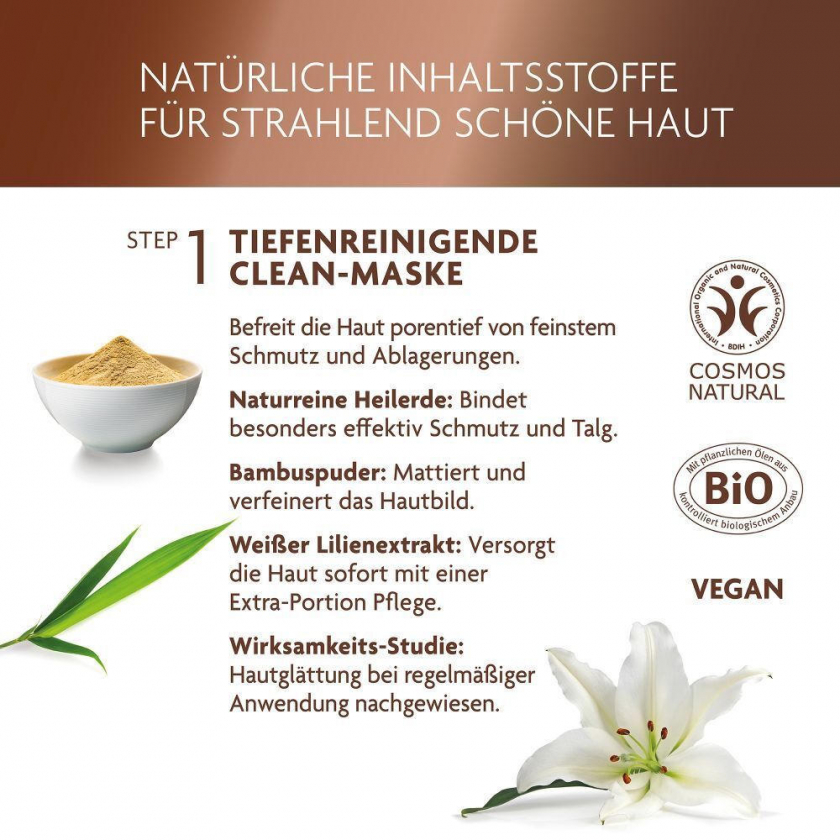 Состав: Clean Maske: вода, сорбит, масло семян подсолнечника, спирт, глицерин, глицерилстеарат цитрат, лесс (лечебная глина), цетеариловый спирт, глицерилстеарат, сок бамбука, масло косточек абрикоса*, токоферол, экстракт листьев гамамелиса, экстракт луковицы белой лилии, цинк PCA, алюминий-магний силикат, ксантановая камедь, пальмитиновая кислота, стеариновая кислота, гидроксид натрия, левулиновая кислота, левулинат натрия, парфюм, лимонен**, цитраль**, линалоол**, гераниол**, диоксид титана, гидроксиды железа. Hydro Booster: вода, спирт, глицерин, масло семян подсолнечника, коко-каприлат/капрат, бетаин, глицерилстеарат, масло семян рапса*, масло семян сафлора*, стеароилглутамат натрия, ксилитилглюкозид, ангидроксилитол, бентонит, масло семян винограда*, кофеин, аргинин, глюкоза, токоферол, аскорбил пальмитат, гиалуронат натрия, экстракт плодов инжира*, экстракт фукуса пузырчатого, PCA натрия, миристил миристат, ксантановая камедь, ксилит, миристиловый спирт, цетеариловый спирт, цетеарил сульфат натрия, лимонная кислота, левулиновая кислота, левулинат натрия, анисат натрия, парфюм. *ингредиенты органического происхождения **компоненты натурального парфюмерного масла