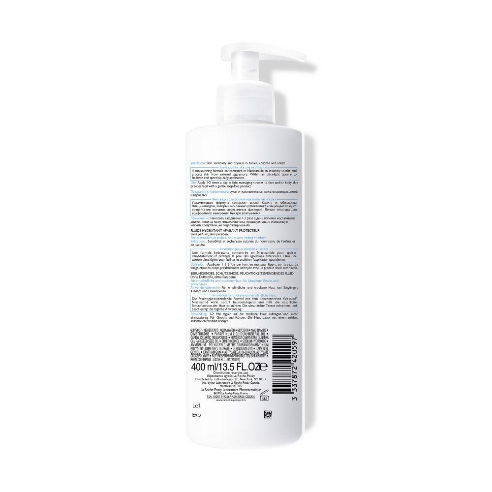 La Roche Posay Lipikar Fluide - ультралегкая увлажняющая лосьон-флюид для тела для сухой, склонной к аллергии кожи. Содержит термальную воду, масло ши и ниацинамид, успокаивает кожу, снимает зуд, укрепляет липидный барьер. Быстро впитывается, не оставляет жирного блеска, без отдушек, протестировано дерматологами.