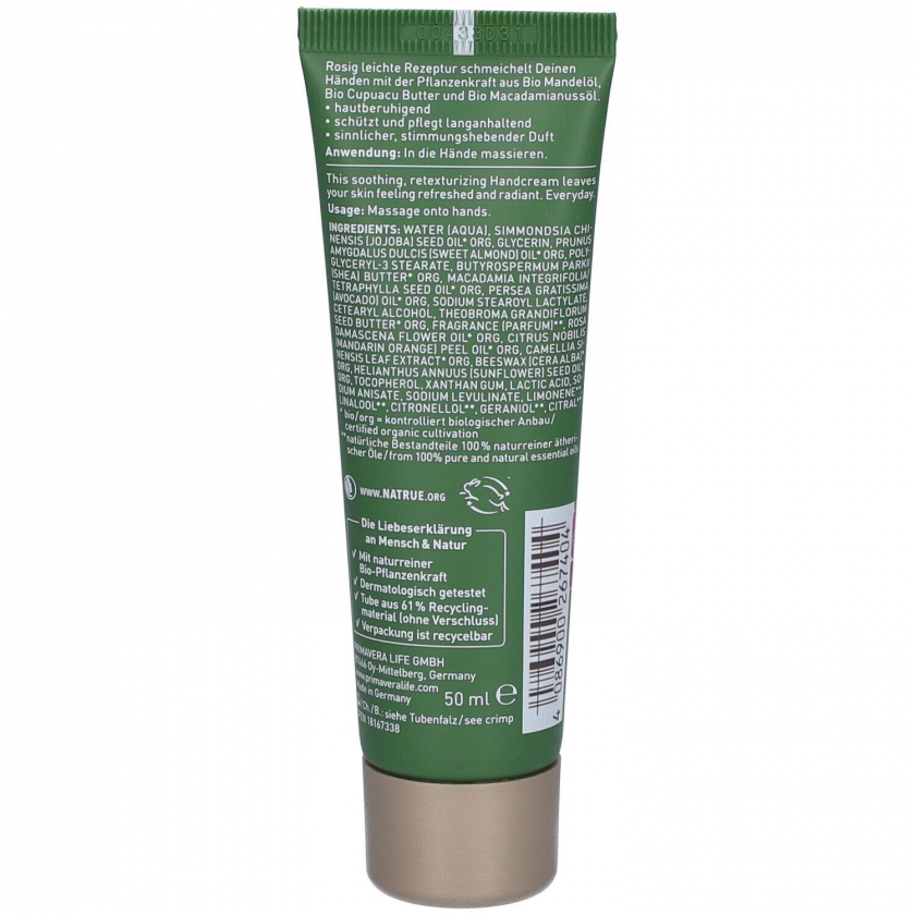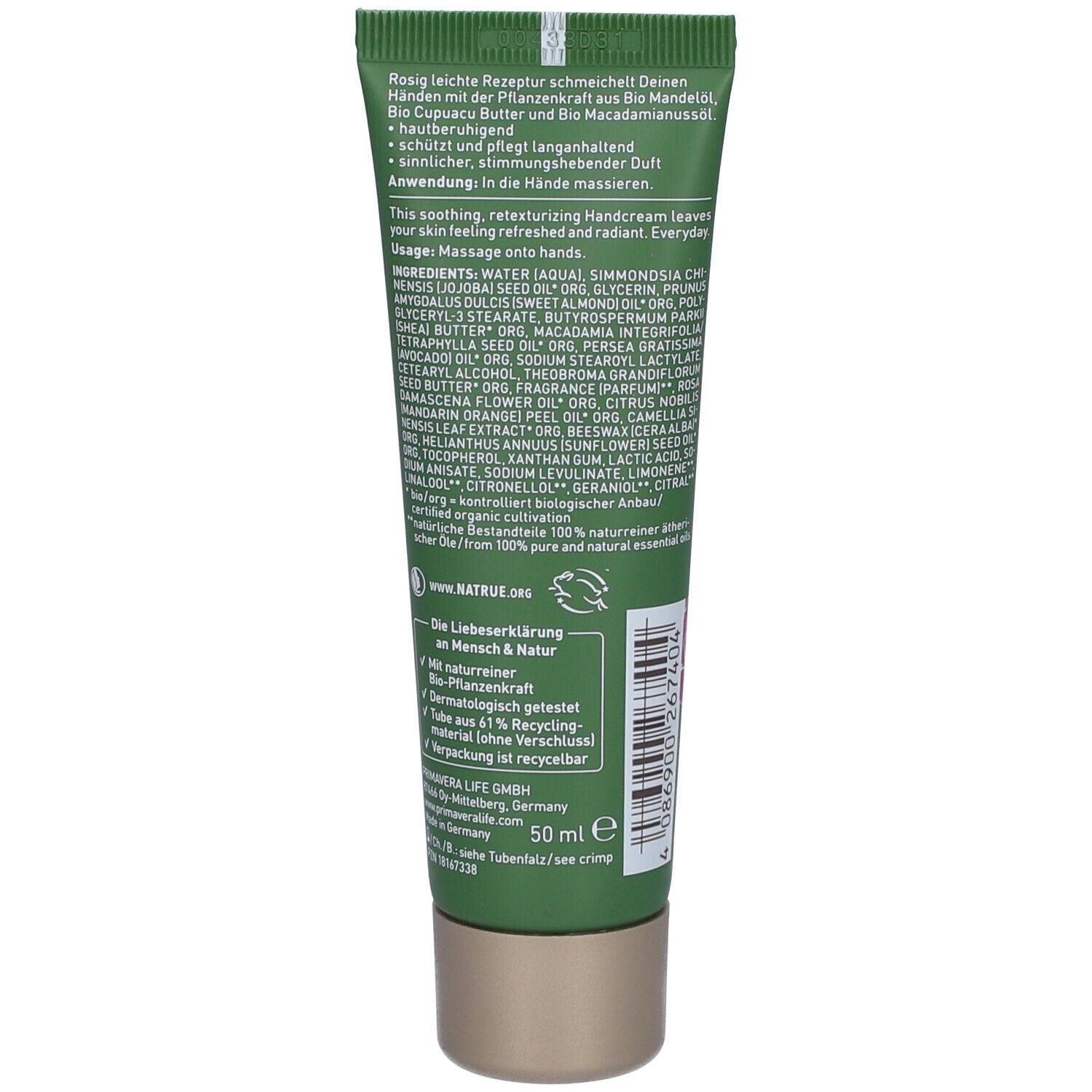 Легкая органическая крем-уход для рук PRIMAVERA Alles Liebe с ароматом розы и мандарина. Содержит натуральные масла жожоба, миндаля, ши и макадамии для интенсивного увлажнения и питания кожи рук. Подходит для ежедневного использования.