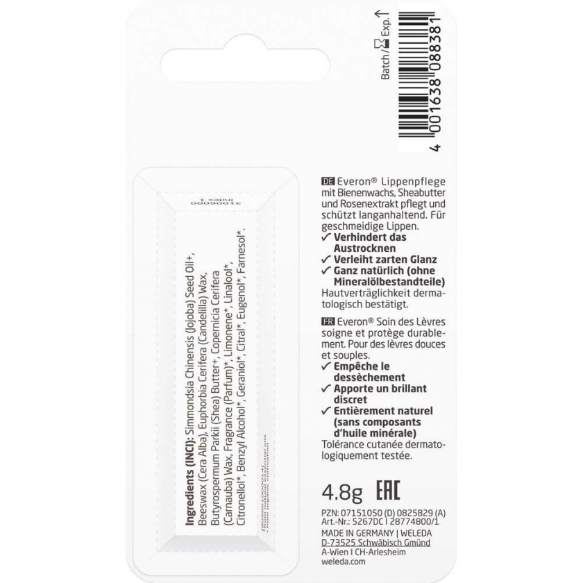 Weleda Everon - натуральный бальзам для губ с пчелиным воском, маслом ши и жожоба. Защищает от сухости, придает нежный блеск и делает губы мягкими и гладкими. Содержит 100% натуральные ингредиенты, включая экстракты ванили и розы.