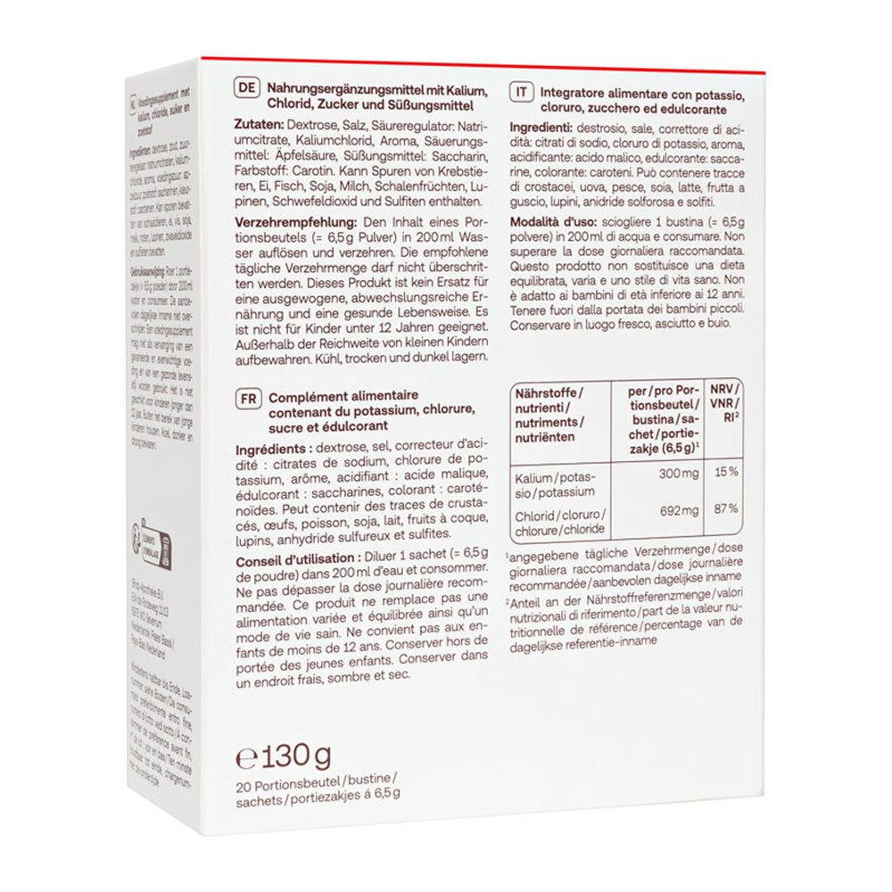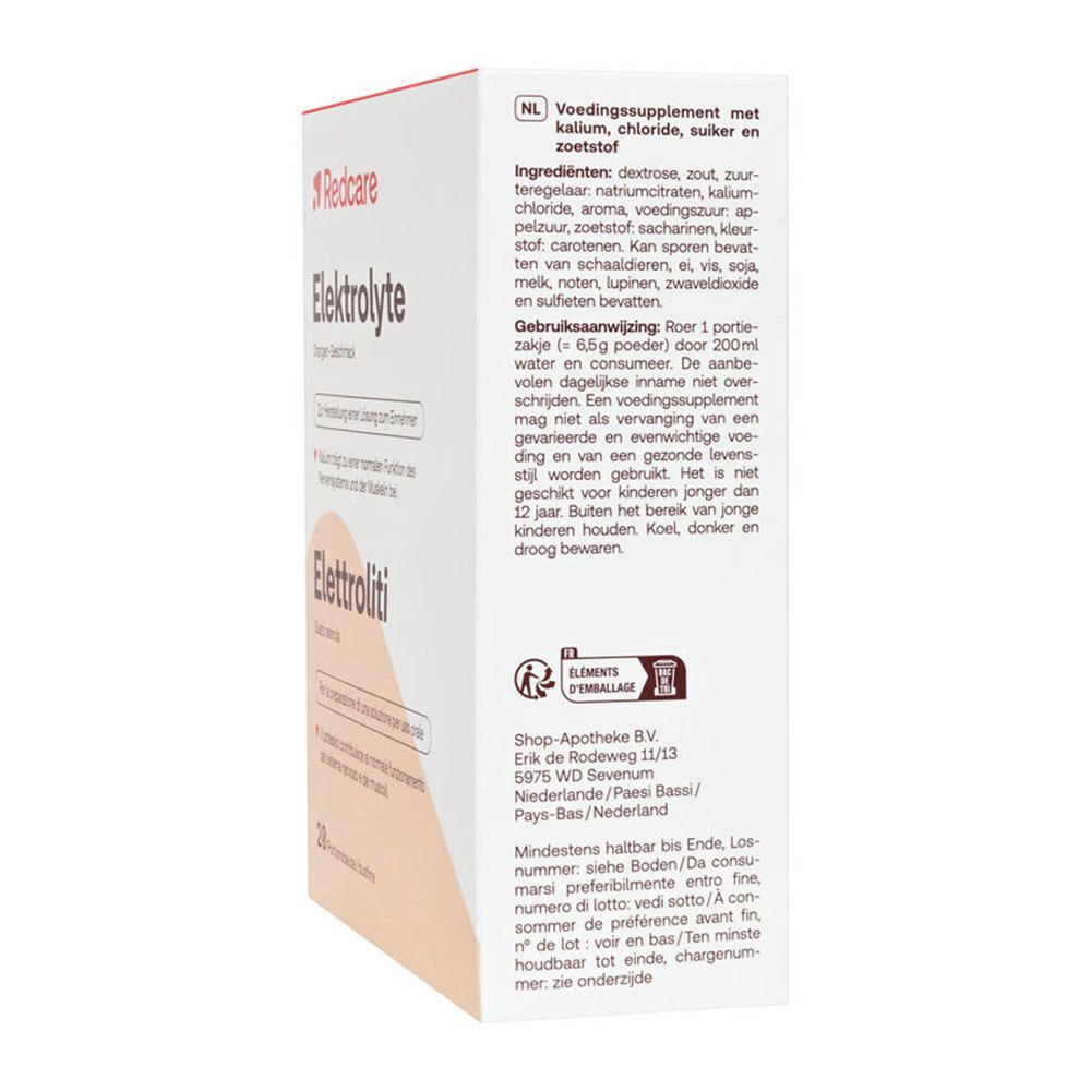 Redcare Elektrolyte - электролитный напиток в порционных пакетиках с апельсиновым вкусом. Содержит минералы калий и хлорид, а также декстрозу. Предназначен для восстановления электролитного баланса после спортивных нагрузок, при диарее или после употребления алкоголя. Одна порция содержит 300 мг калия (15% суточной нормы) и 693 мг хлорида (87% суточной нормы).