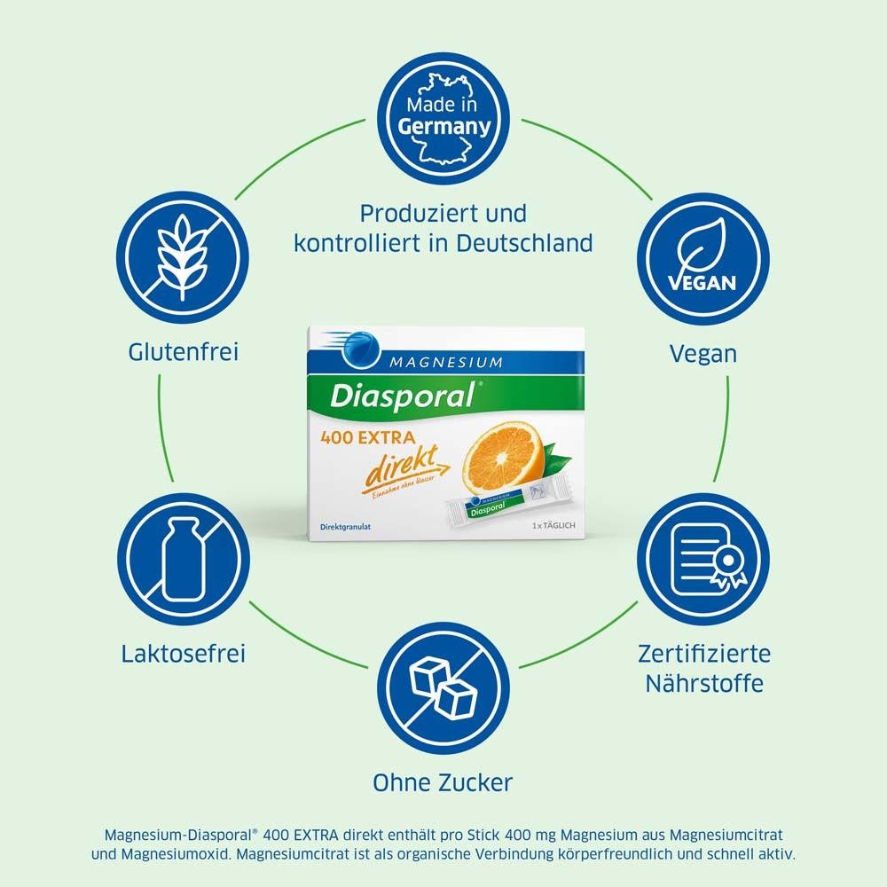 Магниевая пищевая добавка Diasporal 400 EXTRA direkt Orange - быстрорастворимые гранулы с апельсиновым вкусом для восполнения повышенной потребности в магнии. Содержит 400 мг магния в одном стике, способствует нормальной функции мышц и нервной системы. Без сахара, без искусственных подсластителей, подходит для веганов, без глютена и лактозы.