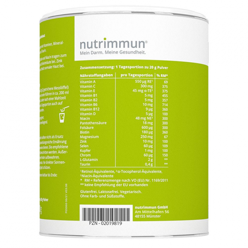 Nutrimmun MUCOZINK - пищевая добавка с витаминами, минералами, глутамином и таурином для поддержания здоровья кожи, слизистых оболочек и иммунной системы. Содержит комплекс витаминов A, C, E, группы B, цинк, селен, магний и другие микроэлементы. Подходит для взрослых и детей с 4 лет, без глютена и лактозы, с натуральным ароматом.