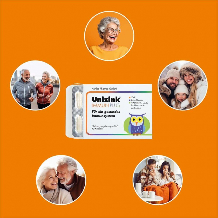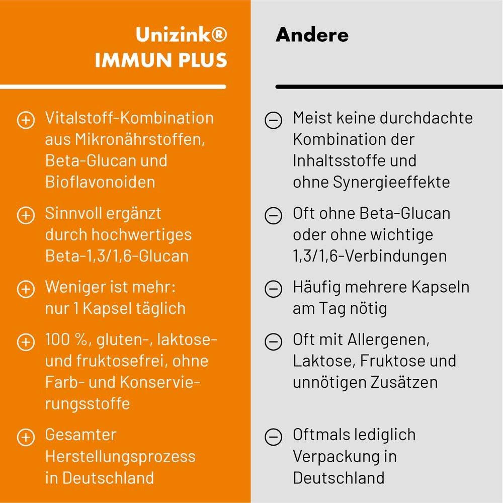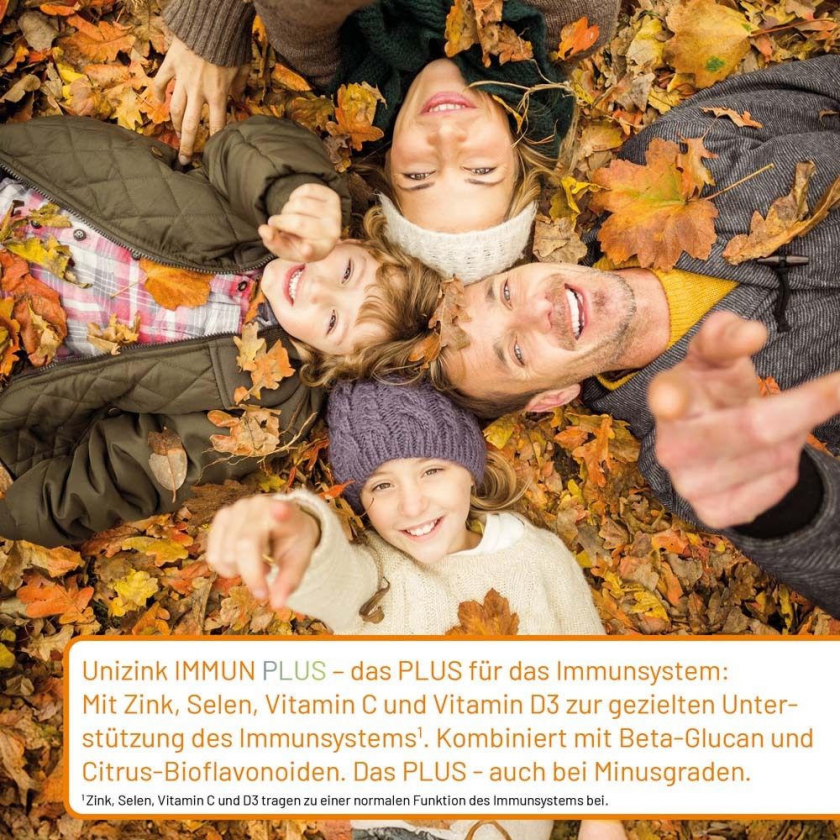 Unizink® IMMUN PLUS - пищевая добавка для поддержки иммунной системы, содержащая цинк, бета-глюкан, витамины C, E, D, селен и цитрусовые биофлавоноиды. Способствует нормальной функции иммунитета, защищает от вирусов, бактерий и свободных радикалов. Подходит для взрослых, вегетарианцев, не содержит глютен, фруктозу, лактозу и искусственные добавки.