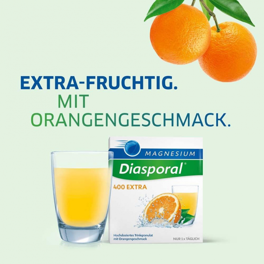 Magnesium-Diasporal® 400 EXTRA - пищевая добавка с высоким содержанием магния (400 мг на стик) в форме цитрата для быстрого усвоения. Подходит при повышенной потребности в магнии, поддерживает мышечную функцию. Без сахара, глютена и лактозы. Растворимое гранулированное средство с натуральным апельсиновым вкусом.