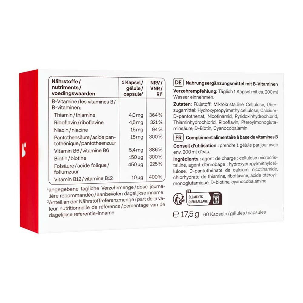 Redcare Vitamin B-Komplex Forte - это пищевая добавка, содержащая все 8 витаминов группы B в высокой дозировке. Комплекс включает тиамин (B1), рибофлавин (B2), ниацин (B3), пантотеновую кислоту (B5), пиридоксин (B6), биотин (B7), фолиевую кислоту (B9) и кобаламин (B12). Рекомендуется для поддержания энергетического обмена и уменьшения усталости. Упаковка содержит 60 капсул.