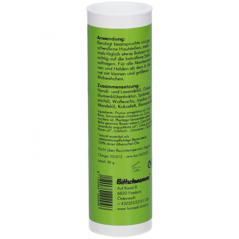 Успокаивающий бальзам homedi-kind® Autsch Balsam для ухода за раздраженной кожей детей от 6 месяцев. Содержит эфирные масла и экстракт подорожника для успокоения кожи после мелких травм и приключений. Подходит для детей и взрослых.