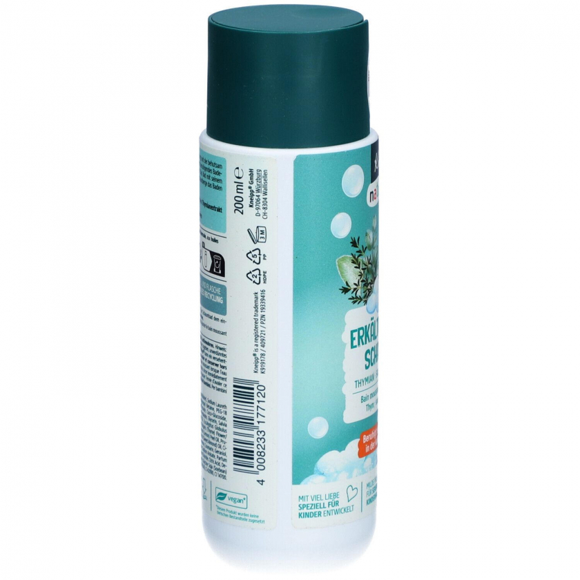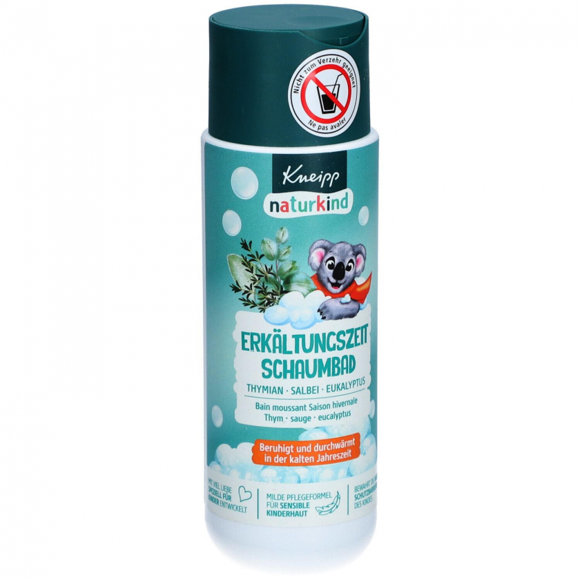 Детское пенное средство для ванны Kneipp Naturkind Erkältungszeit с маслами тимьяна, шалфея и эвкалипта. Успокаивает и согревает в холодное время года, специально разработано для чувствительной детской кожи. 98% ингредиентов биоразлагаемы.