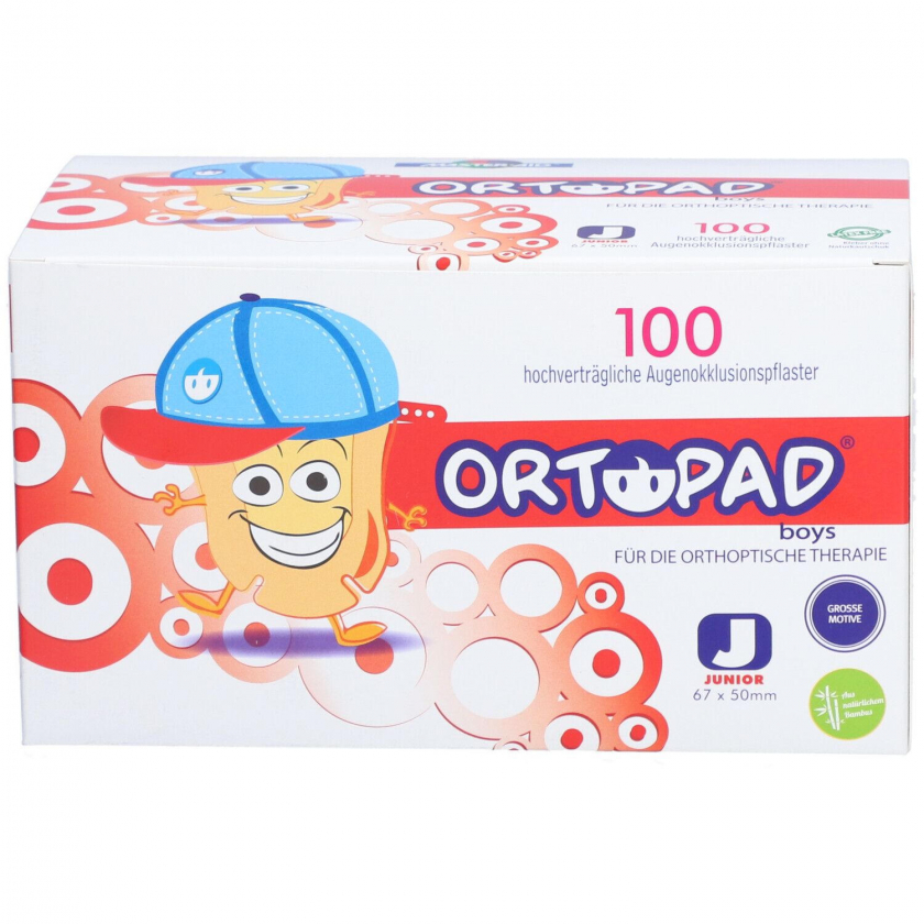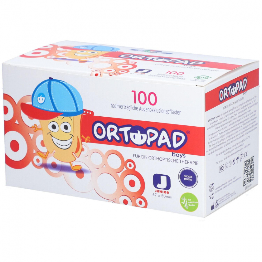 Детские глазные окклюзионные пластыри ORTOPAD® для лечения амблиопии (ленивого глаза) с яркими мотивами для мальчиков и девочек. Изготовлены из бамбукового волокна, имеют анатомическую форму с носовыми прорезями, светонепроницаемы и воздухопроницаемы. Доступны в трех размерах: Junior, Medium, Regular.