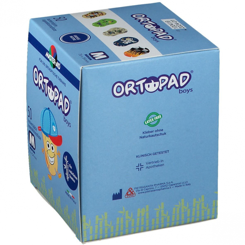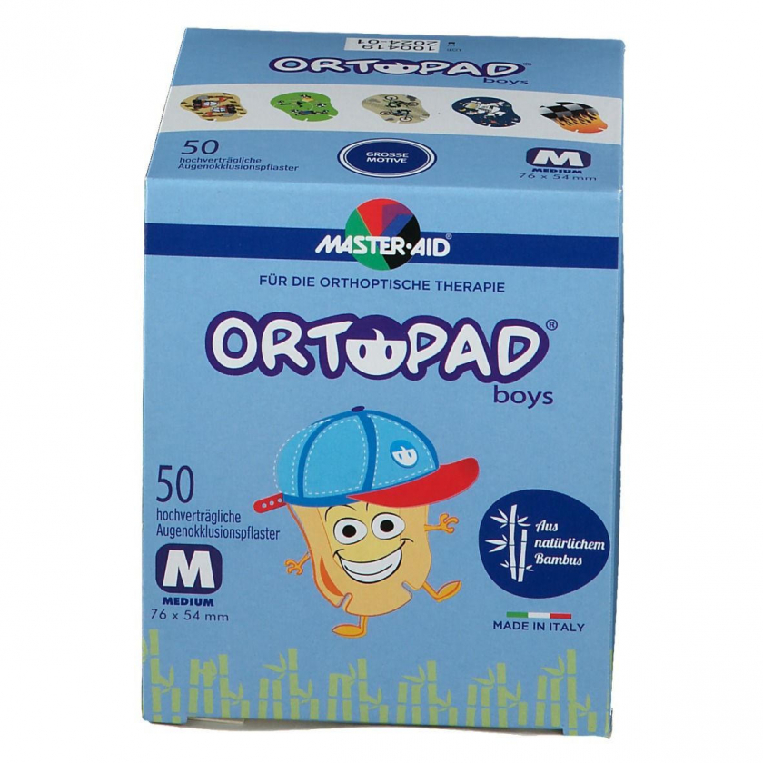 ORTOPAD Cotton Medium Boys - мягкие дышащие глазные пластыри для мальчиков 2-5 лет. Изготовлены из 100% хлопка, светонепроницаемые, воздухопроницаемые, с анатомической формой и носовыми прорезями. Гипоаллергенный клей, без латекса, с блестящими эффектами. Размер 76x54 мм для лечения амблиопии.
