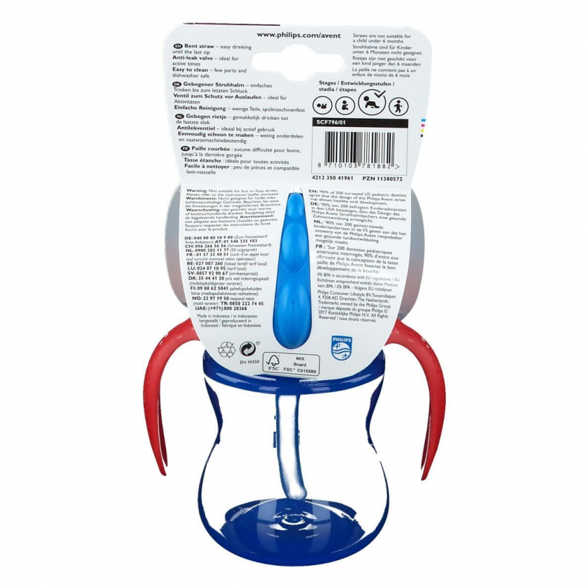 Детский поильник Philips Avent с соломинкой и ручками синего цвета, объемом 200 мл. Способствует здоровому развитию ротовой полости, тренирует мышцы рта, имеет эргономичные ручки, гибкую соломинку, защитный клапан от проливания и все части можно мыть в посудомоечной машине.