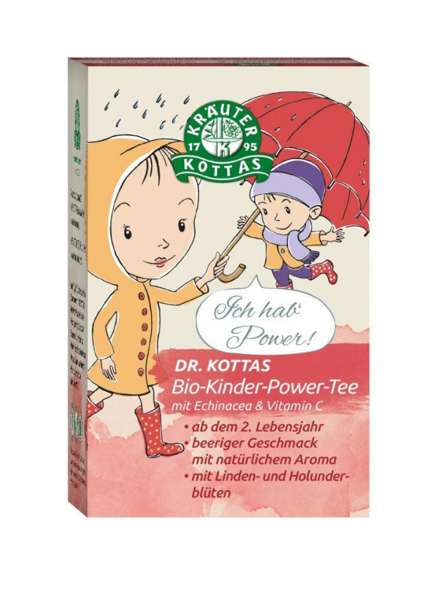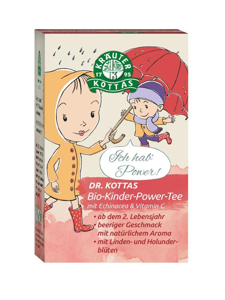 Органический детский травяной чай DR. KOTTAS Bio-Kinder-Power-Tee с фруктово-ягодным вкусом, обогащенный эхинацеей и натуральным витамином C из ацеролы. Содержит цветки липы и бузины для поддержки иммунитета детей. Произведен в Австрии из органических ингредиентов, 20 фильтр-пакетов по 125 мл.