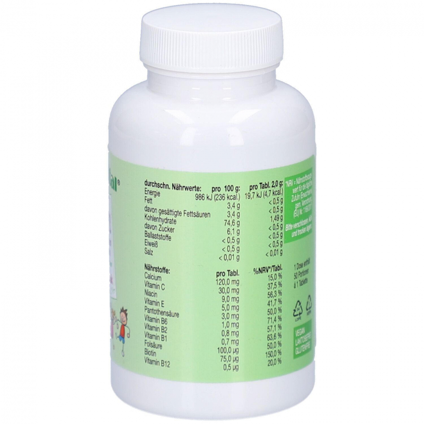 Состав: Сорбит (сахарозаменитель), карбонат кальция, фруктоза, лимонная кислота (подкислитель), крахмал, растительные жиры (гидрогенизированные), витамин C, ароматизаторы, мальтодекстрин, никотинамид, стеарат магния (антислеживающий агент), витамин E, свекольный сок (краситель), витамин B1, витамин B2, фолиевая кислота, биотин, витамин B12