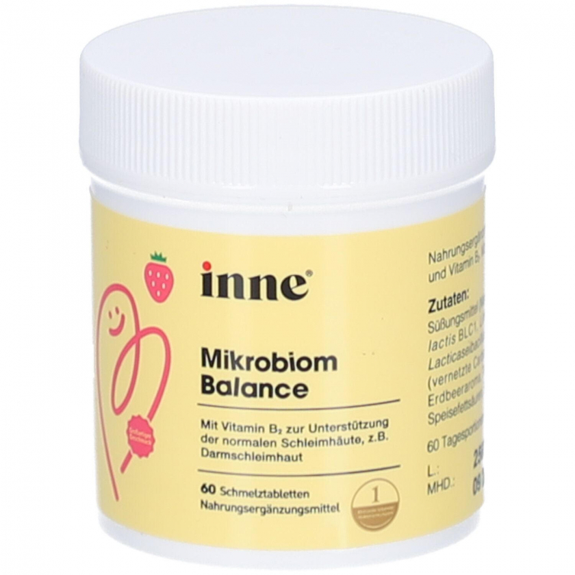 inne® Mikrobiom Balance - это пищевая добавка в виде шмельттаблеток с клубничным вкусом для детей от 3 лет. Содержит 1 миллиард живых бактерий innebiome™ и витамин B2 для поддержания нормального состояния слизистых оболочек, включая слизистую кишечника. Без сахара, веганский, без глютена и лактозы.