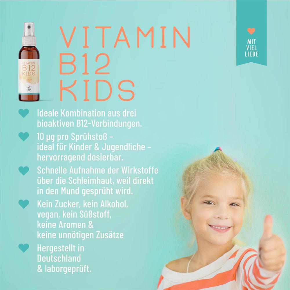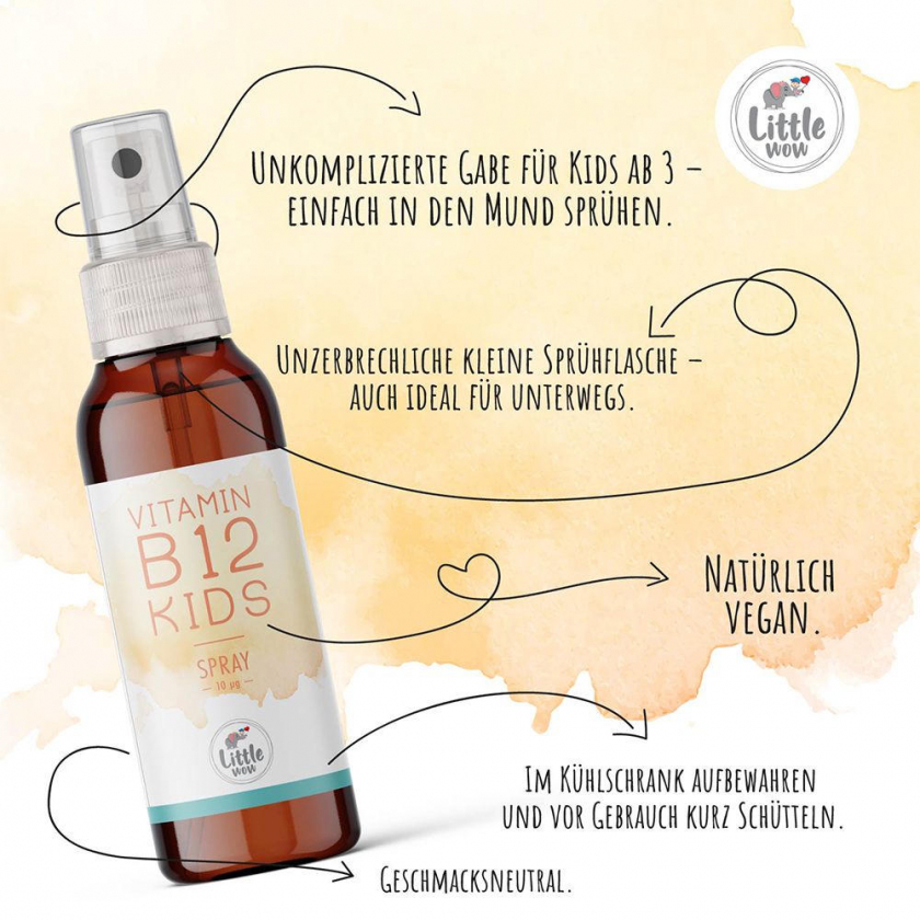 Детский витамин B12 в форме спрея для детей от 3 лет. Содержит три наиболее биологически активные формы витамина B12 для быстрого усвоения. Без сахара, подсластителей, ароматизаторов и добавок, полностью веганский продукт.