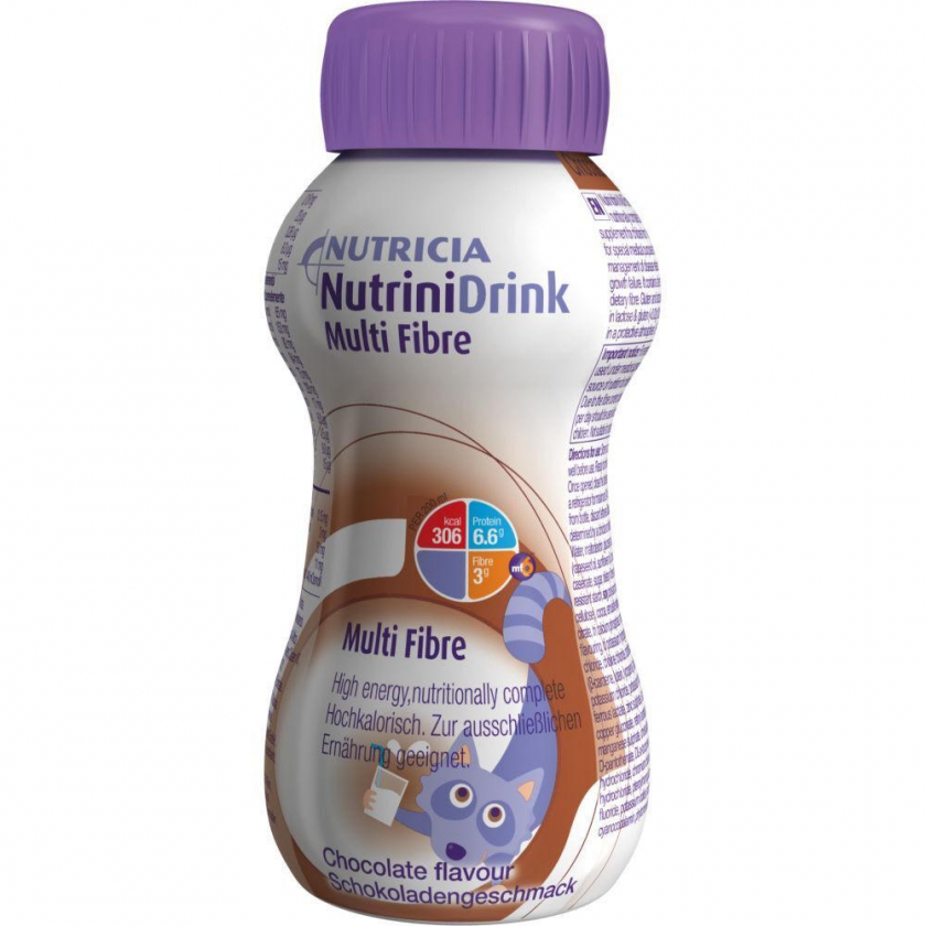 NutriniDrink MultiFibre Schokogeschmack - высококалорийное специализированное питание для детей с функциональным желудочно-кишечным трактом. Содержит 6 различных пищевых волокон, легко усваиваемый молочный белок, сбалансированный состав витаминов и минералов. Шоколадный вкус. Без глютена. Подходит для детей от 1 до 12 лет в качестве основного или дополнительного питания.