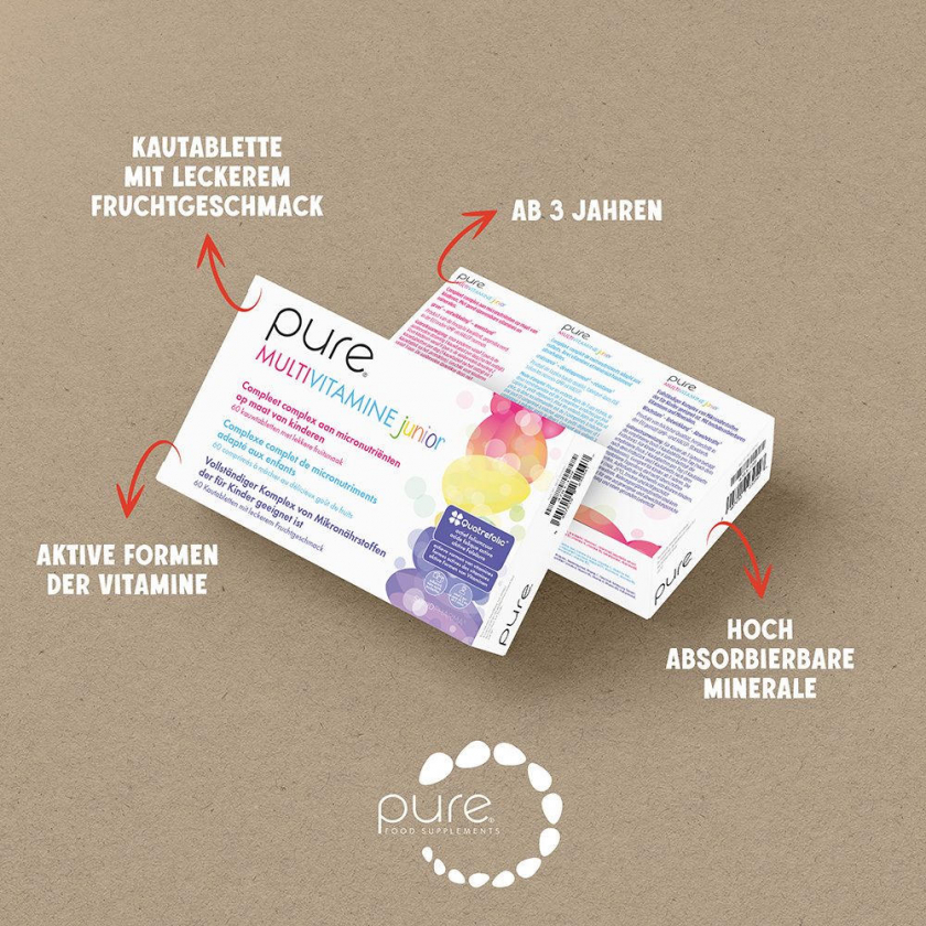 Pure® Multivitamine Junior - детские жевательные витамины с фруктовым вкусом для поддержки роста, развития и иммунитета. Содержит 12 витаминов и 5 минералов в специальной детской дозировке. Без сахара, глютена, сои и лактозы. Подходит для детей от 3 лет.