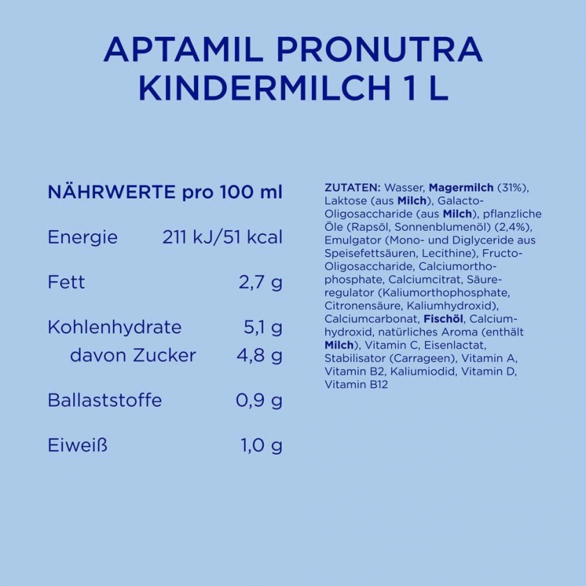 Aptamil Kindermilch 1 Plus - готовая к употреблению детская молочная смесь для детей от 1 года. Обогащена витаминами A, C, D для поддержки иммунитета, содержит ALA (Омега-3), кальций и железо. Подходит для ежедневного питания, можно употреблять холодным или теплым. Объем 1 литр.