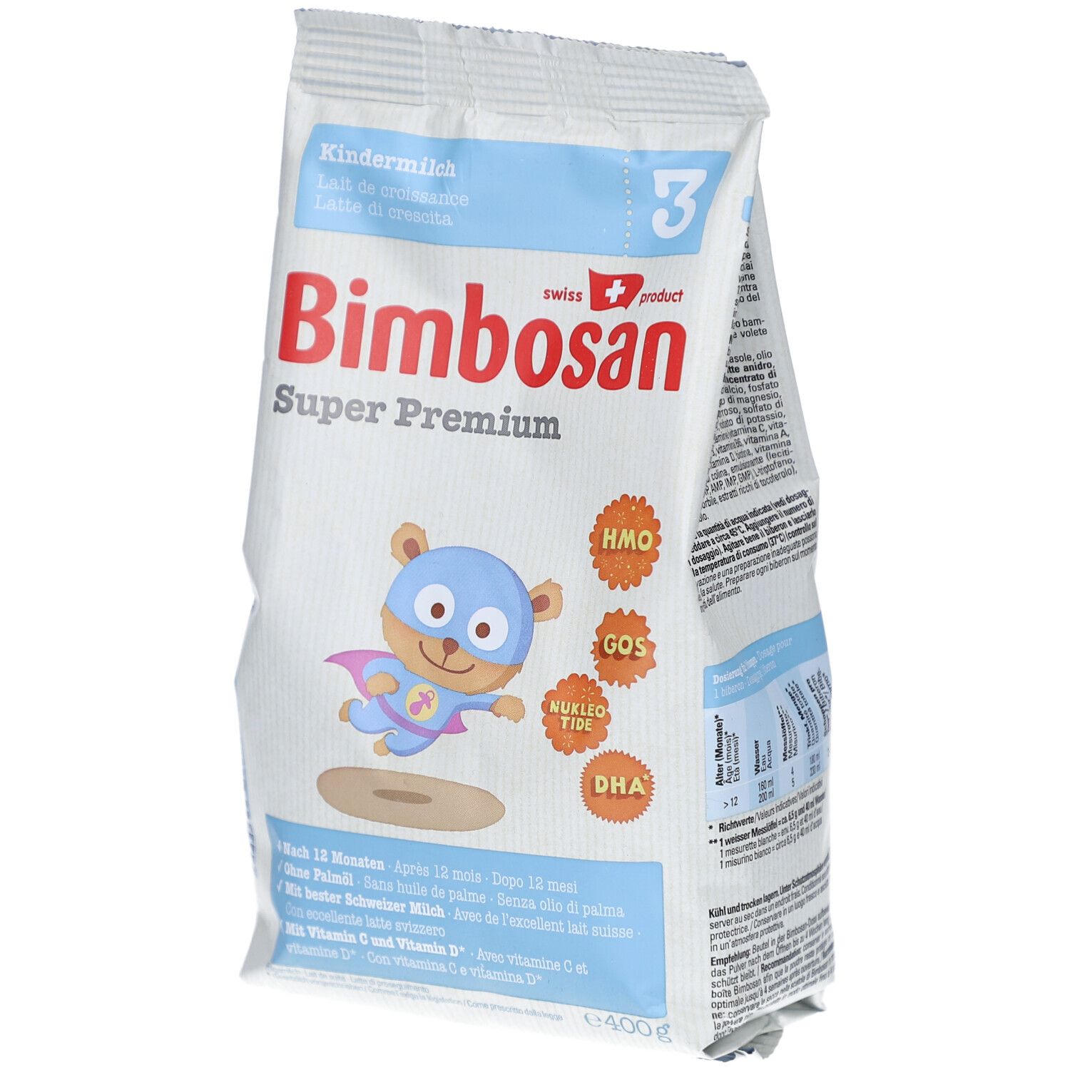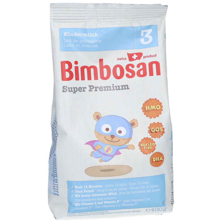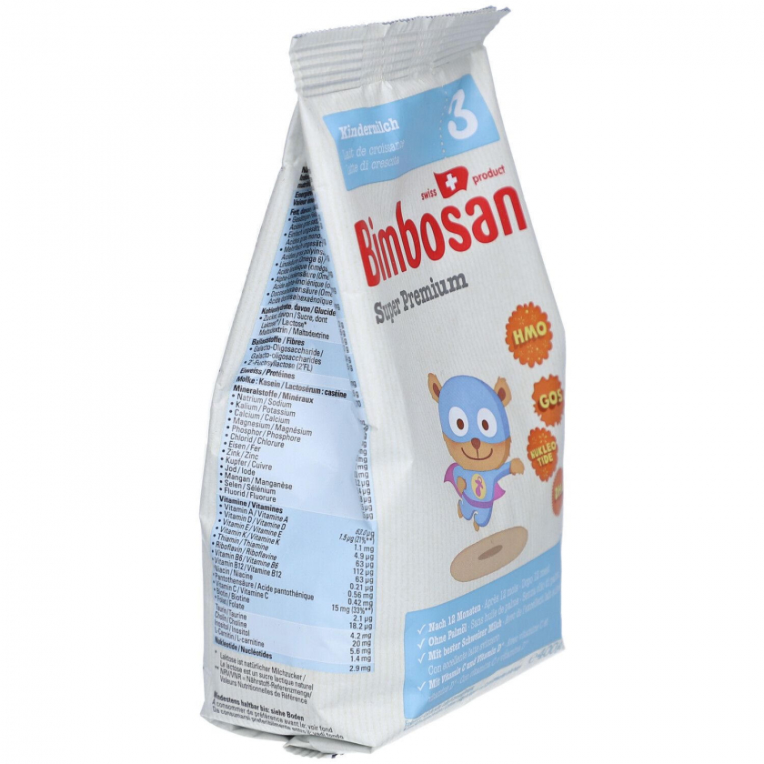 Bimbosan Super Premium 3 - детская молочная смесь для детей от 12 месяцев, произведенная из швейцарского молока без пальмового масла. Содержит витамины C и D, пребиотик HMO 2'FL для поддержания здоровой микрофлоры кишечника и укрепления иммунитета. Богата железом, кальцием и другими важными питательными веществами для здорового роста и развития ребенка.