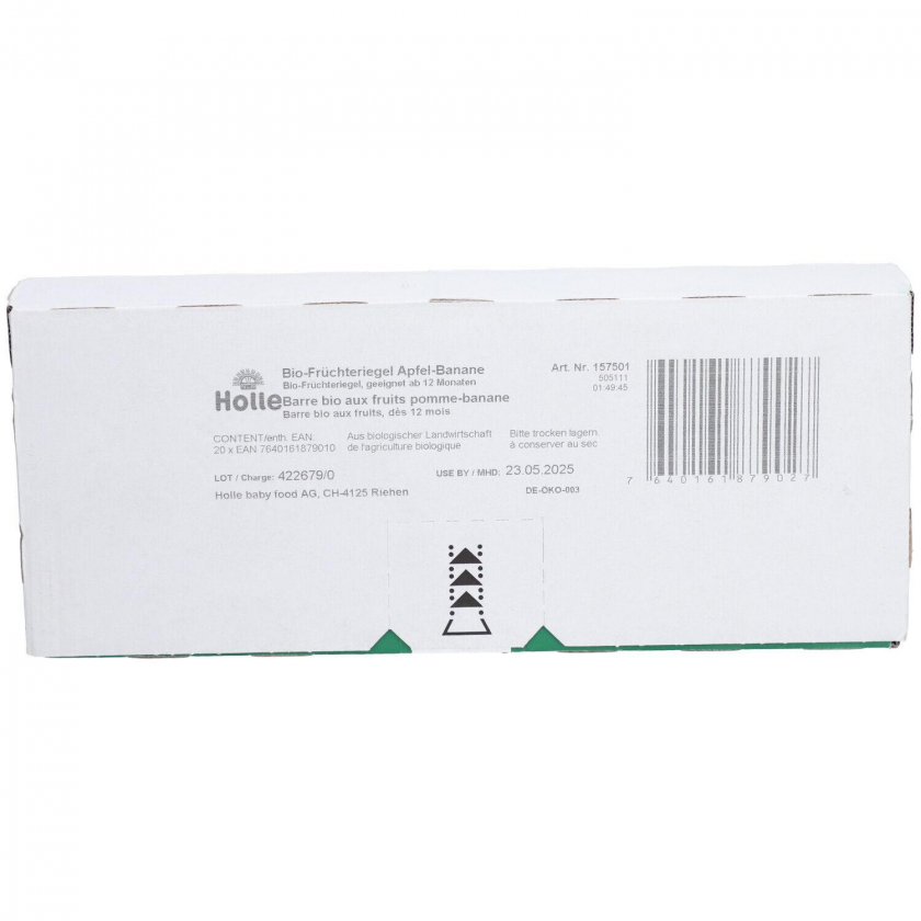Органический фруктовый батончик Holle с яблоком и бананом для детей от 12 месяцев. Без добавления сахара, соли, специй или ароматизаторов. Содержит натуральные фрукты и злаки, удобный формат для перекуса на ходу. Произведено в Швейцарии из органических ингредиентов.