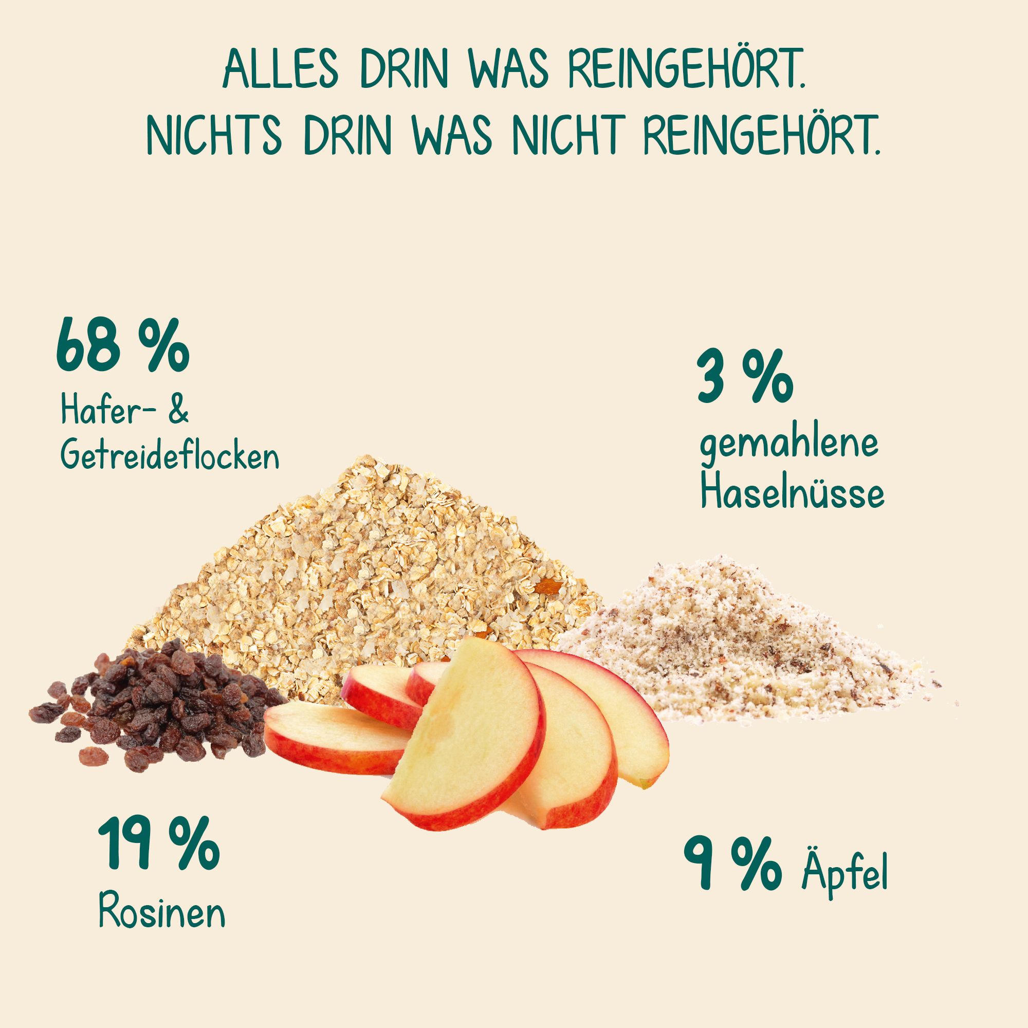 Овсяные хлопья (56%), изюм (19%), зерновые хлопья (из овсяной муки) (12%), сушеные кусочки яблока (5%), яблочный порошок (4%), молотый фундук (3%), карбонат кальция, витамин B1, витамин D